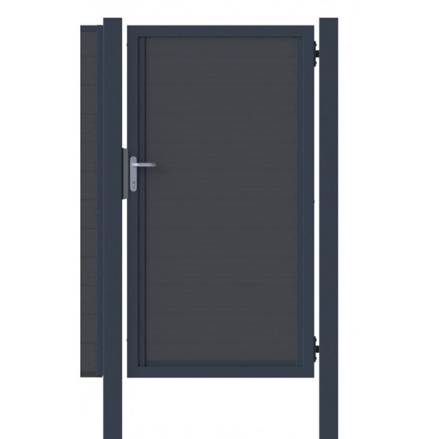 Avec cadre en acier en anthracite RAL 7016 et remplissage en plastique pour protection visuelle, y compris poteaux 100x100 mm, ferrures, cylindre et clé.