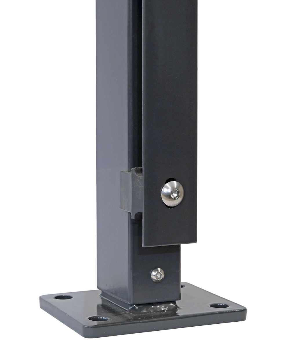 Pfosten FL 60x40 mm mit Flacheisenleiste 40x5 mm, Aluminiumkappe und angeschraubter Fussplatte.