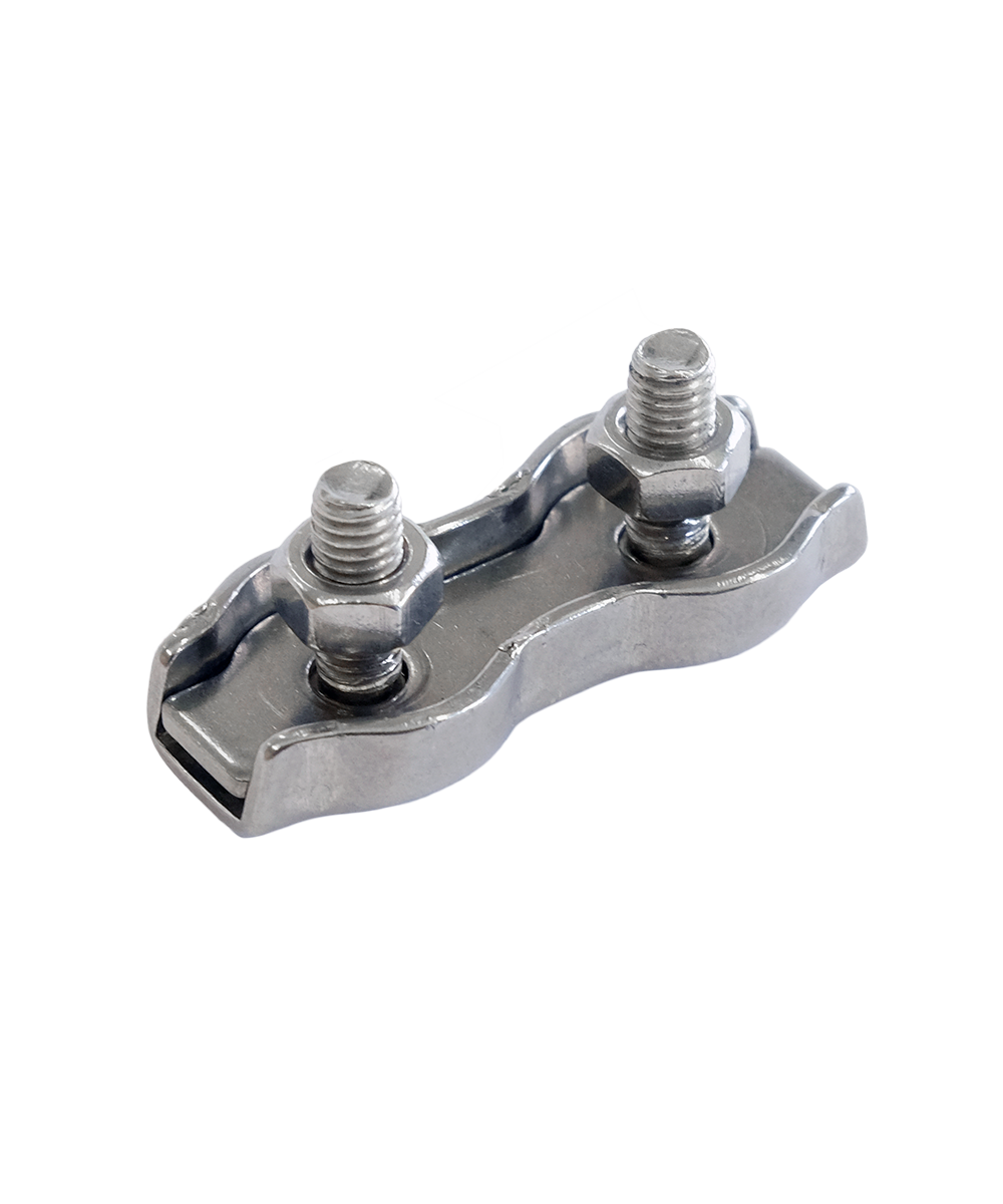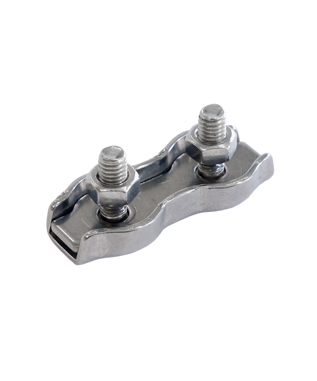 Für rostfreies Drahtseil mit 4 mm Durchmesser, inkl. zwei Muttern und Klemmstück.